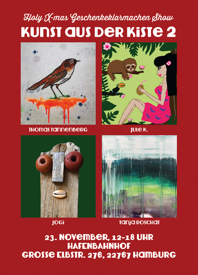Am Sonntag, 24. November 2024 von 12 bis 18 Uhr findet die Ausstellung KUNST aus der KISTE - SUBKULTUR meets CLUBKULTUR The Big Hafenbahnhof Holy X-mas Geschenkeklarmachen Show - Volume1 statt. Cheap Art - Folk Art - Comic Art - Pop Art - Country Art - von 10 bis 400 Euro Wir alle kennen Geschenke die keiner braucht, schließlich sind wir damit aufgewachsen. Danke dafür!!! Aber soll denn alles so bleiben wie immer? Selbstverständlich NICHT !!!! Tanja Roschat und Thomas Tannenberg und ich malten die Bilder für die Kunstkisten und Jogi gab seine Skulpturen hinzu. Der Hafenbahnhof sorgt für lecker Kuchen, Kaffeespezialitäten und Glühwein, mit Super-DJ E.A. Robert (ab 15 Uhr) - Fertig ist die Sause! Kunst aus der Kiste. Hafenbahnhof, Große Elbstraße 276, 22767 Hamburg (nahe S-Bahn Altona, Buslinie 111 und 113) Ich freue mich auf euch!